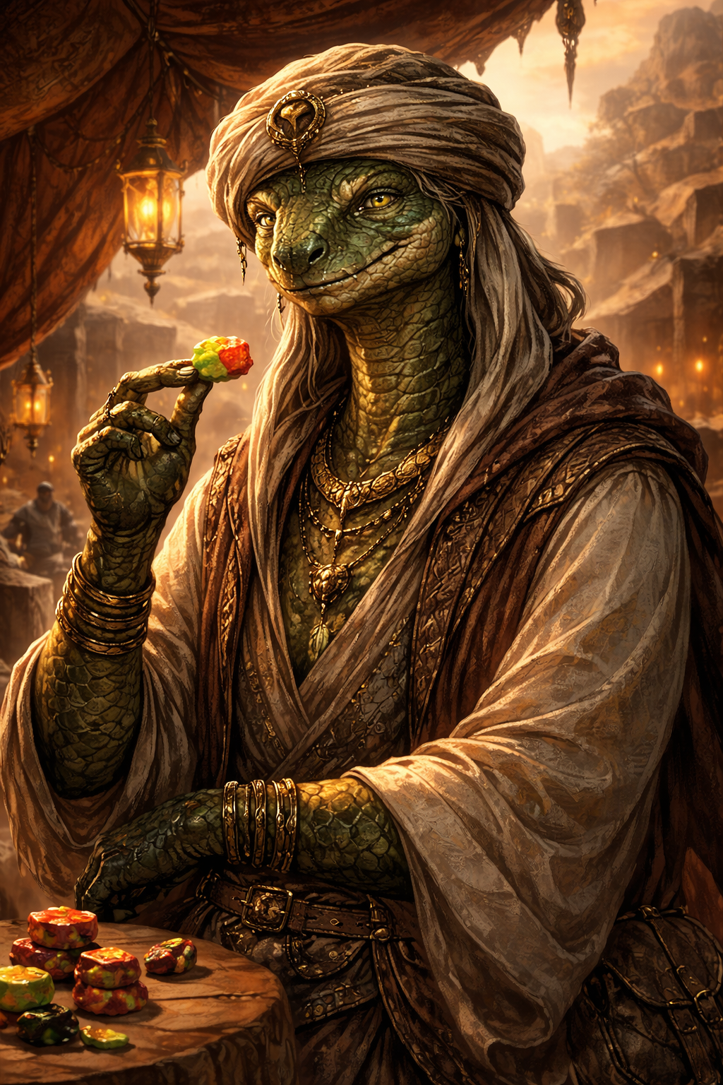 Sssssssnaipi é um yuan-ti de escamas verde-oliva com nuances douradas que refletem a luz do sol do deserto de Barabat como metal gasto. Seu corpo é esguio e flexível, com postura relaxada, quase preguiçosa, mas cada movimento denuncia precisão absoluta. O rosto alongado possui olhos âmbar verticais, sempre semicerrados, como se estivesse avaliando probabilidades invisíveis. As presas curtas raramente ficam à mostra, mas o sorriso fino que ele exibe costuma causar desconforto. Veste túnicas leves de tecidos desérticos, bem cuidadas, adornadas com pequenos símbolos de jogos — dados entalhados, fichas de osso e cartas marcadas escondidas nos punhos. Sempre carrega uma pequena bolsa de couro cheia de doces cristalizados.